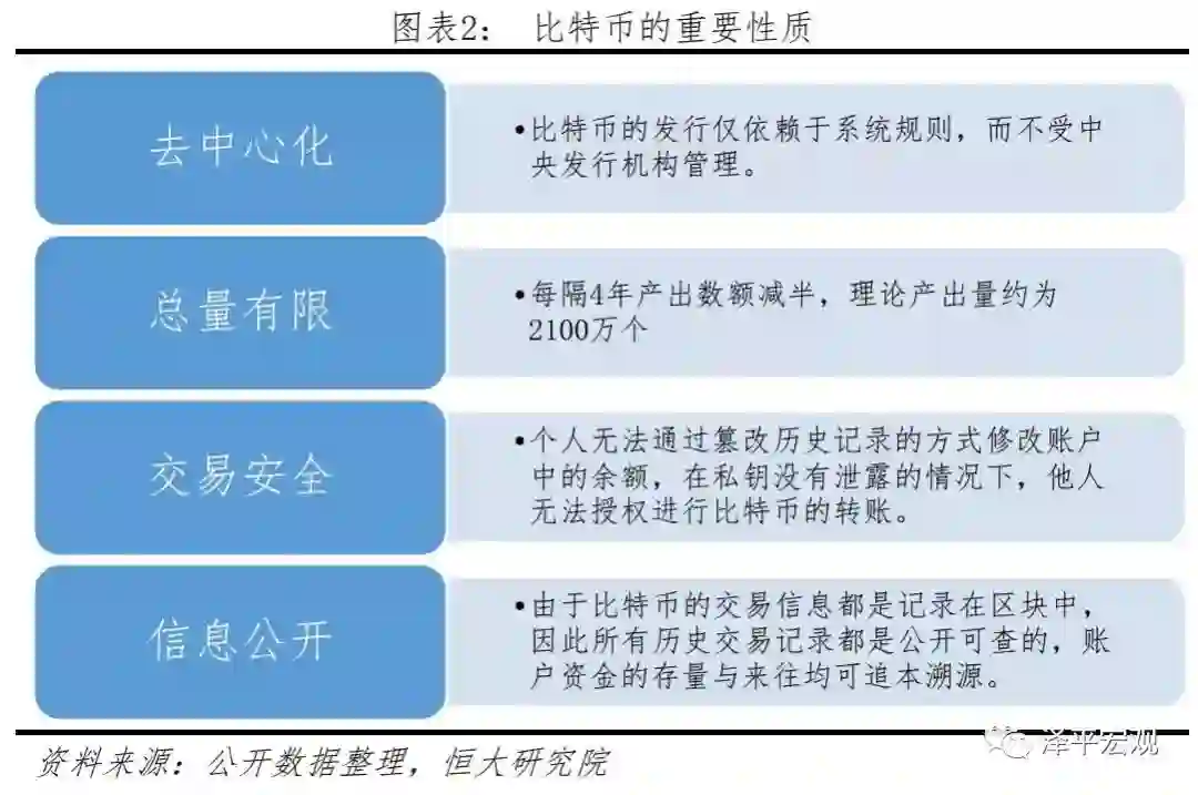 比特币是去中心化虚拟货币的典型代表,开创了区块链技术,具备去中心化、总量有限、交易安全、信息公开的超前时代的特点。比特币产生于2008年的金融危机,源于对中心式银行的担心、对通胀式货币的不信任。