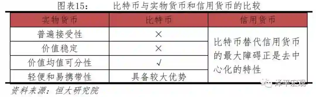 对比实物货币的四个特征发现,比特币在普遍接受性和价值稳定两方面尚不能媲美黄金等实物货币,但可以满足价值均匀可分性,在轻便和易携带性上具备实物货币难以比拟的优势。