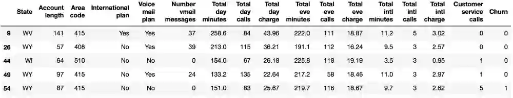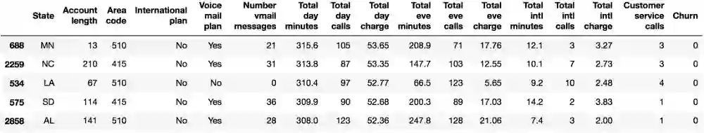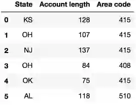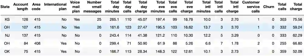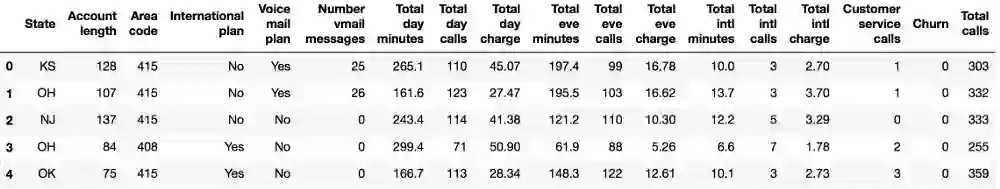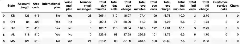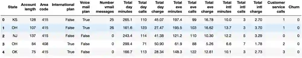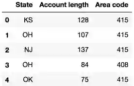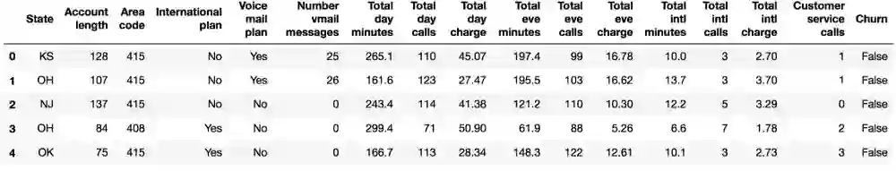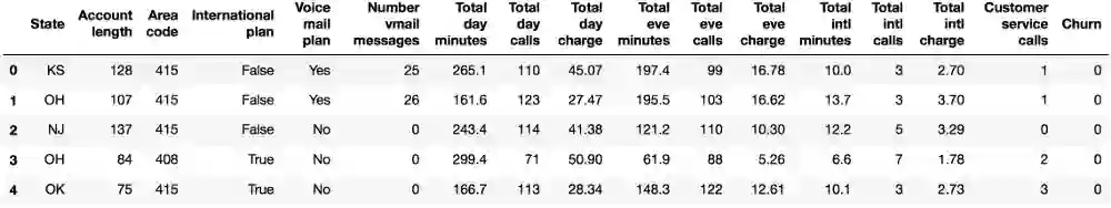 我们将通过分析电信运营商的客户离网率数据集来展示Pandas的主要方法。我们首先通过read_csv读取数据,然后使用head方法查看前5行数据: