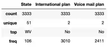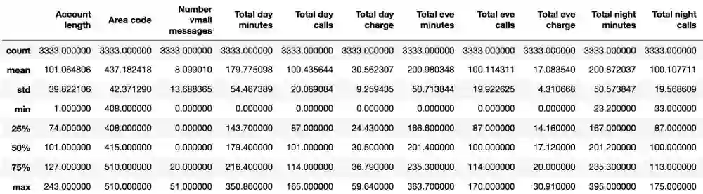 bool、int64、float64和object是我们特征的数据类型。这一方法同时也会显示是否有缺失的值。在上面的例子中答案是没有缺失,因为每列都包含3333个观测,和我们之前使用shape方法得到的数字是一致的。