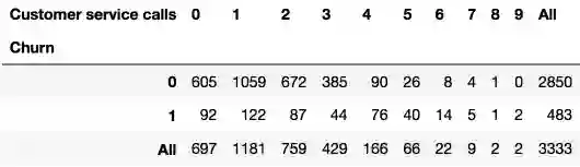 因此,预测客户呼叫客服超过3次,且已开通国际套餐的情况下会离网(Churn=1),我们可以期望的精确度为85.8%的精确度(我们只有464+9次弄错了)。我们基于非常简单的推理得到的数字85.8%,可以作为一个良好的开端(我们即将创建的更多机器学习模型的基线)。
