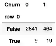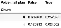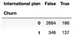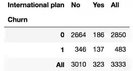 假设我们想知道样本的Churn(离网)和International plan(国际套餐)的分布,我们可以使用crosstab方法构建一个列联表(contingency table):