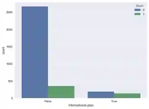 让我们看下International plan(国际套餐)变量和离网率的相关性。我们将通过crosstab列联表来查看这一关系,我们也将使用Seaborn进行可视化分析(不过,可视化分析的更多内容将在本系列的下一篇文章介绍):