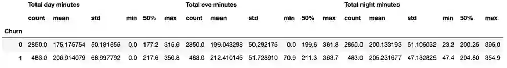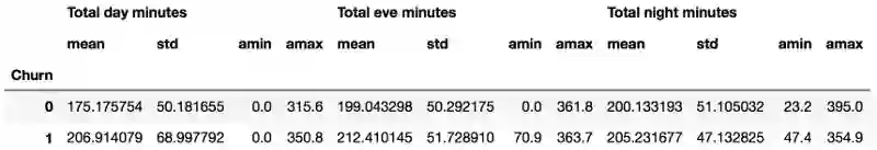 在下面的例子中,我们根据Churn变量的值分组数据,显示每组的统计数据: