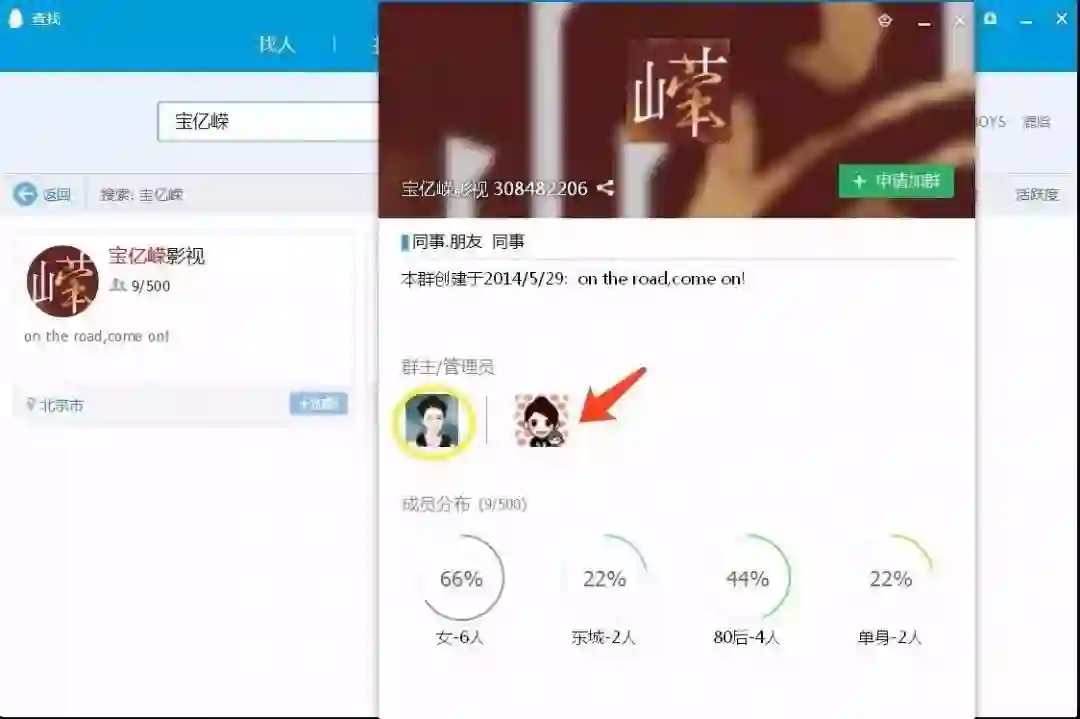 出现群页面,箭头就是马蓉本人,群主是宝亿嵘CEO任晓妍,也就是王宝强现任经纪人:
