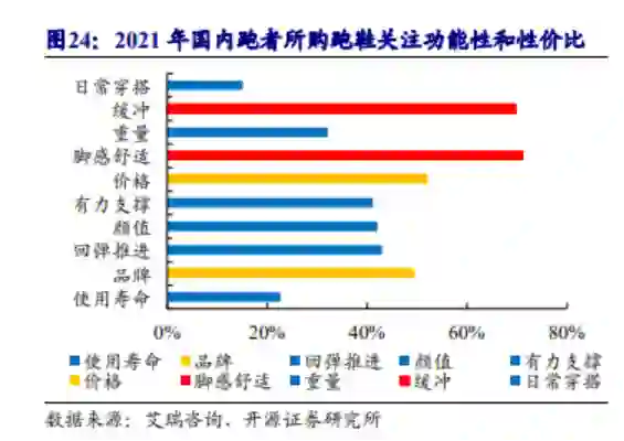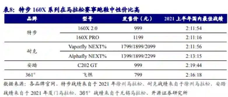 产品力之外,特步跑鞋的高性价比优势也为其增粉不少。根据艾瑞咨询数据,功能性(缓冲、脚感舒适)与性价比是国内跑者最为关注的跑鞋要素。以特步160X系列为例,如图所示,综合售价及马拉松赛事战绩,特步160X系列在高端竞速跑鞋中性价比优势显著。