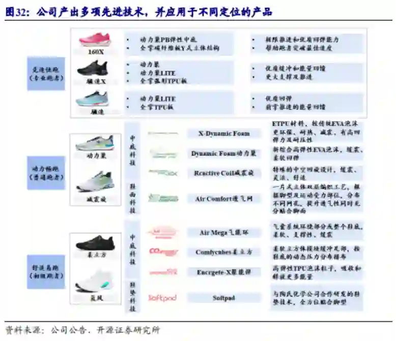 较强的产品力源自特步对技术研发的高度重视。早在2016年,特步就建立了国内首个跑步专属研究中心,产出多项先进技术,目前特步的跑鞋产品线定位全面,覆盖多种跑者群体。