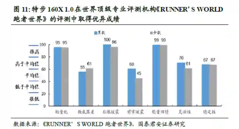 在技术等级方面,以特步160X 1.0跑鞋为例,根据国泰君安研报,在世界级专业评测机构《RUNNER’S WORLD跑者世界》的评测中,特步这款跑鞋的轻量化、后跟缓震、能量回馈等功能均拿到了95分以上的高分。
