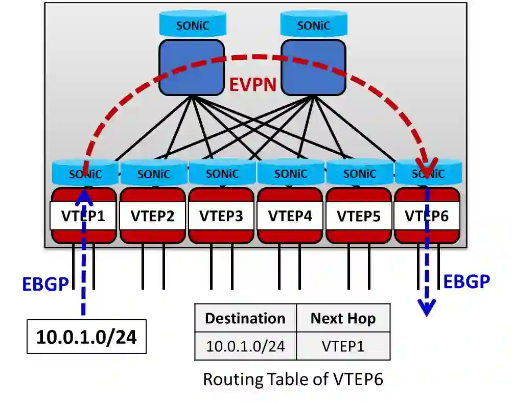 图5: SONiC Chassis的控制平面,在这个例子里,VTEP1上的SONiC直接把10.0.1.0/24的路由信息发送给了VTEP6上的SONiC。