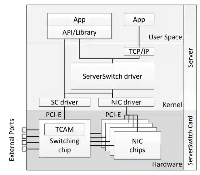 ServerSwitch将商用的交换机芯片和服务器通过高带宽的PCI-E接口连接起来,充分挖掘了交换机芯片和CPU的可编程能力,实现了一个高性能可编程的平台。在2011年,ServerSwitch论文发表在计算机系统和网络的顶级会议USENIX Symposium on Networked Systems Design and Implementation (NSDI) 上,并获得最佳论文奖。