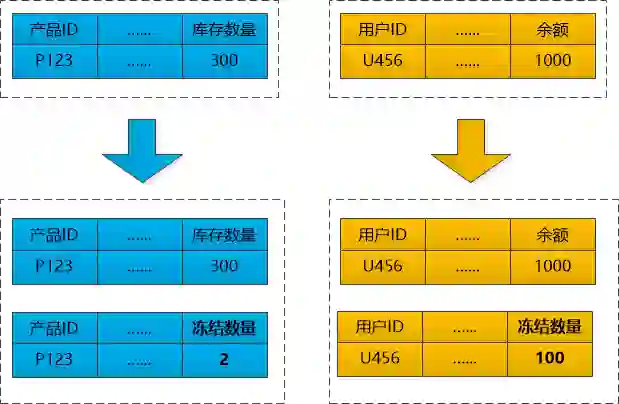 “拿咱们的系统举个例子吧,订单服务要调用库存服务扣减库存(假设数量为2),还要调用支付服务从用户余额扣钱(假设为100), 那订单服务第一步就告诉库存服务,给我冻结2个库存; 告诉支付服务,给我冻结100块钱。在这一步,两个服务要做业务检查,看看库存余额够不够,如果足够,就冻结他们,防止其他调用也进行了扣减操作,导致本次调用余额不足。 这一步,我们称之为尝试(Try)。 ”