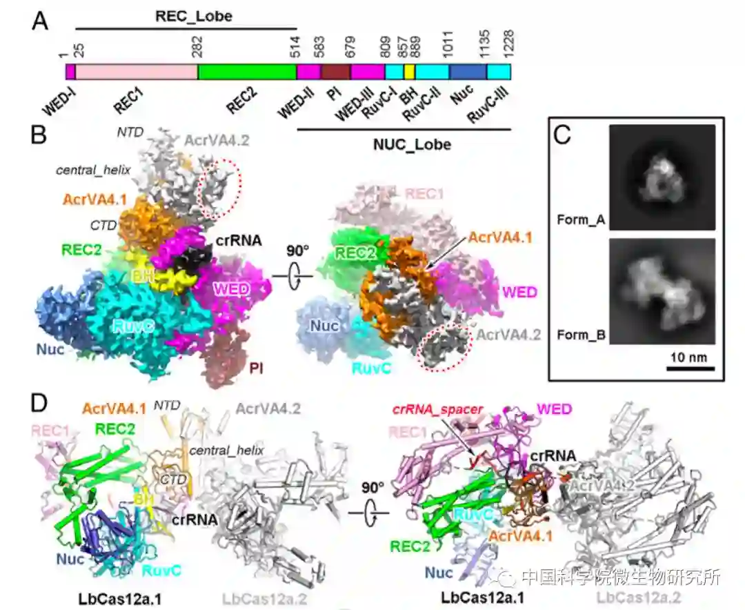 随后,他们利用冷冻电镜单颗粒三维重构技术,解析了AcrVA4与LbCas12a-crRNA结合的原子分辨率的三维结构。