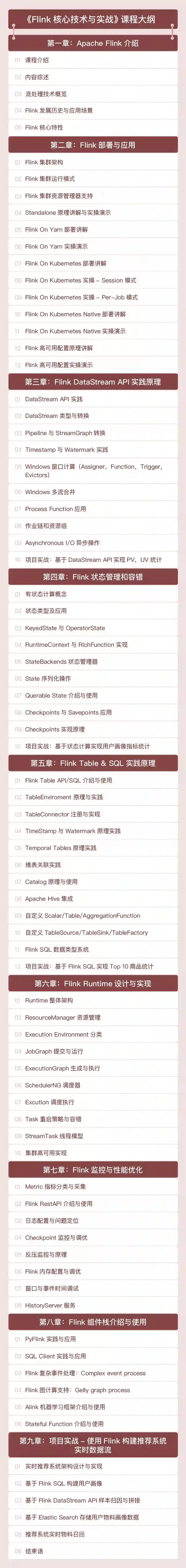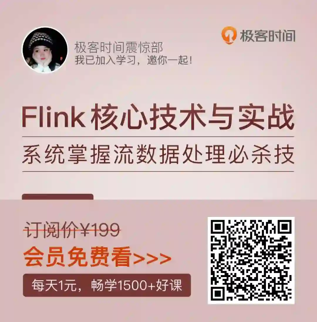 我最近刚看完他写的《Flink 核心技术与实战》视频课,很有启发。总结来说,深入剖析了 Flink Runtime 的设计与实现机制,讲解了 Flink SQL 接口的原理与操作方法,以及 Flink DataStream API 的实践原理,手把手教你构建一个完整的实时推荐数据流系统,让你彻底拿下 Flink。