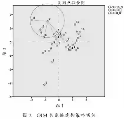 上述144个案例的系统聚类结果,反映了当前学习分析实践在目标、数据、方法选择上的常见组合;而多重对应分析结果则揭示出目标、数据、方法组合之间的相关性。将两者结合,可作为OIM关系链的建构策略。例如:目标类散点CLU10_07表示“警告I识别”,以它为圆心在类别点的联合图中画圆,如图2所示。