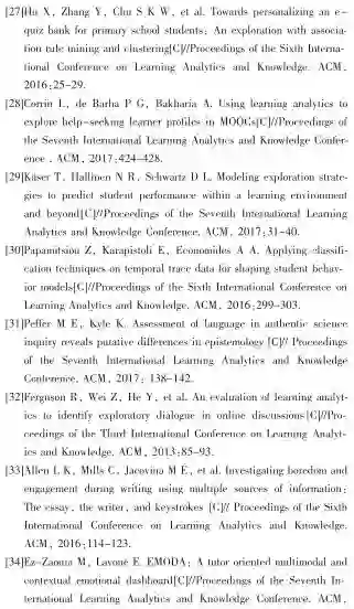 学习分析最根本的任务,就是对学习环境中所捕获的大量学习行为数据进行分析处理,进而加以理解,以促进学习的优化。研究者们通过对学习者的在线视频观看情况、学习任务完成状况、在线测验得分,以及论坛参加与发言等数据进行收集和处理,以可视化方式呈现,形成对个体学习行为的过程报告;或者将学习者的行为痕迹与认知或情感过程进行关联,以协助细致地理解行为所发生的情境。