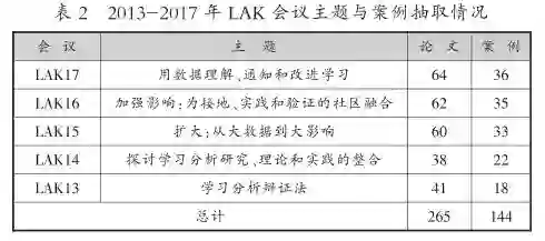 作为学习分析领域最为权威的国际会议之一,LAK会议由学习分析研究协会(Society for Learning Analytics Research,SoLAR)发起并组织。自2011年SoLAR成立以来,每年召开一次。本研究的学习分析实践案例均来自此会议,所选取2013-2017年间LAK会议的主题和案例抽取情况,如表2所示。