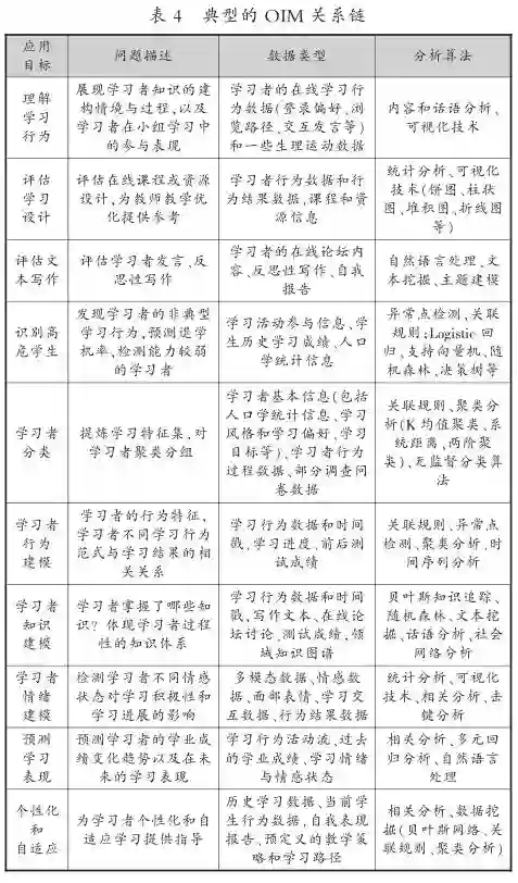 基于上述多重对应分析结果和OIM关系链建构策略,结合当下学习分析应用实践的热点话题,本研究提炼出10条典型的学习分析OIM关系链,如图3、表4所示。