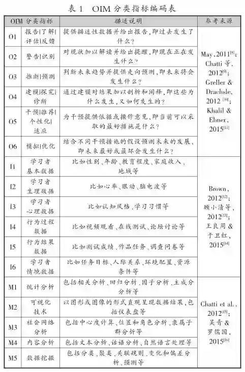 通过梳理国内外关于学习分析实践的典型框架或指导模型,本研究抽取其中常涉及到的目标(简称O)、数据(简称I)、方法(简称M)的分类描述,最终确定了17个OIM分类值,如表1所示。