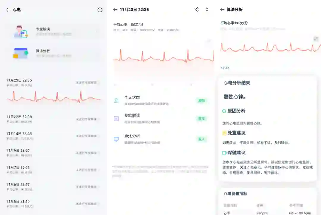 心电图生成后,我们可以进一步提交并进行快速 AI 算法分析,也可以付费请求国家远程医疗与互联网医学中心的医生解读。虽然不论是 AI 算法还是专家远程解读都无法代替医院诊断,但这样的整合能力对于 OPPO Watch 这种第一次做 ECG 功能的产品来说还是相当不错,最重要的是,它总能让我对自己的心脏状况「心里有数」。