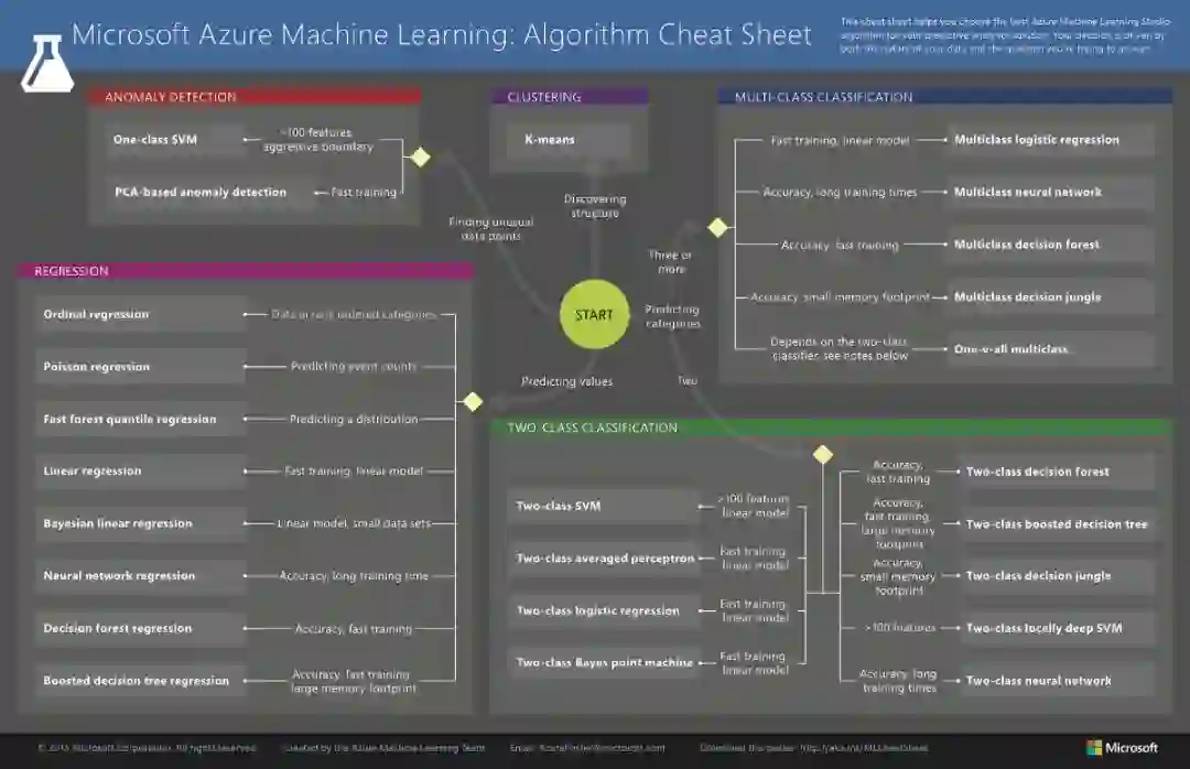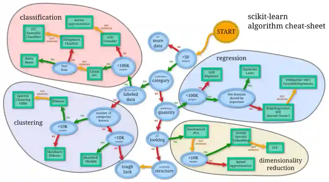 这里有一些有用的流程图和机器学习算法表,我只包括了我所发现的最全面的几个。