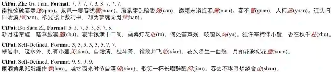 例子中模型不仅可以根据已有的格式模板(例如鹧鸪天、卜算子)进行生成,还能根据我们自己定义的格式进行宋词生成,而且押韵效果也不错。