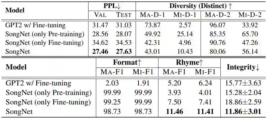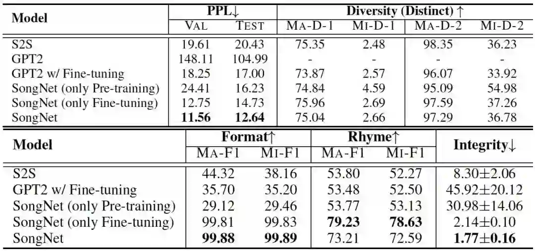 除了常用的文本生成评测指标如ppl、distinct外,我们还专门设计了度量模板准确率(Format)、韵律准确率(Rhyme)和句子完整度(integrity)的指标。