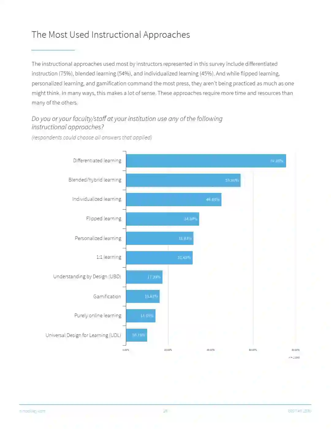 数字化学习的形式很多——从简单的混合式学习到复杂的、需要精通的学习。但是有一些教学形式的使用率更高。下面是我们根据调查结果描绘的教学方法图表。
