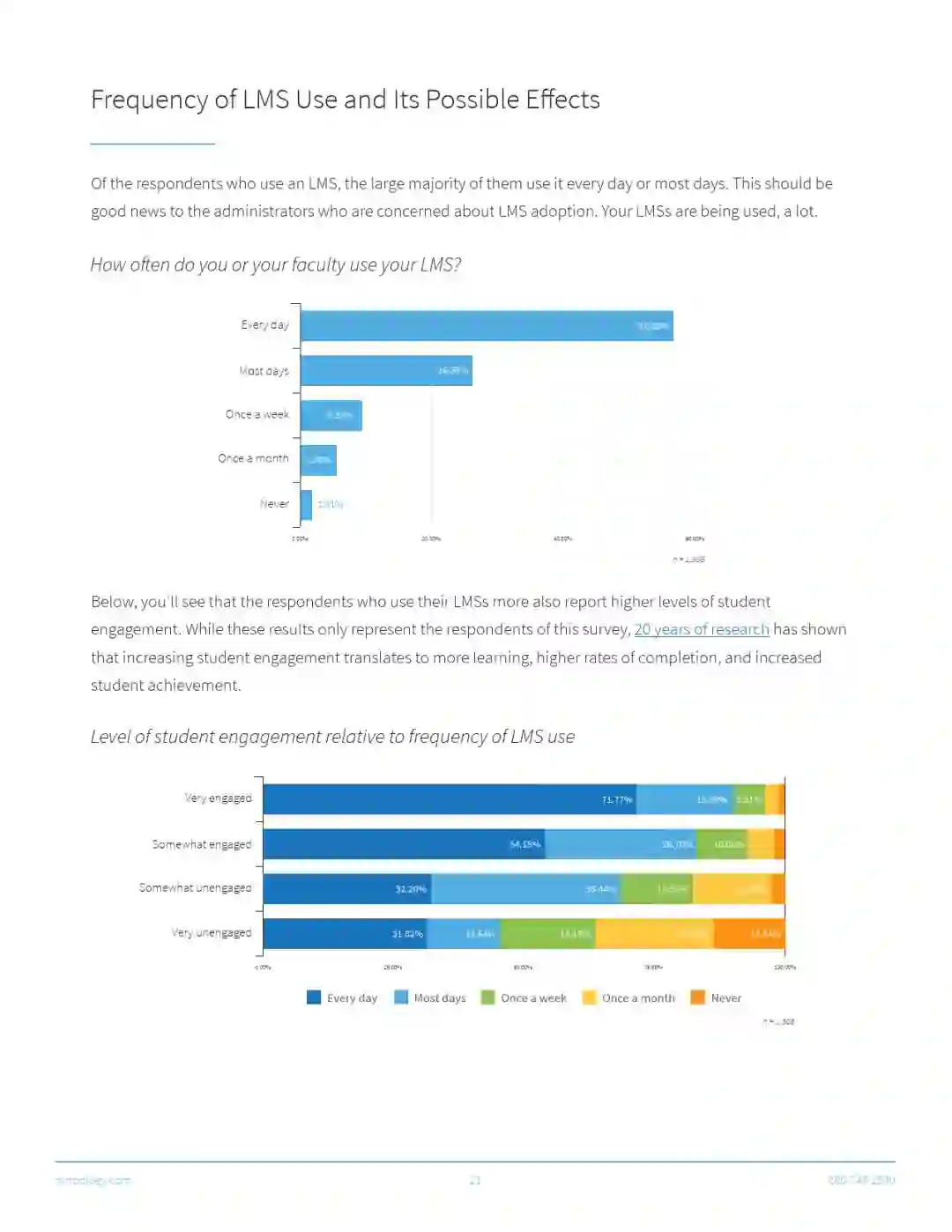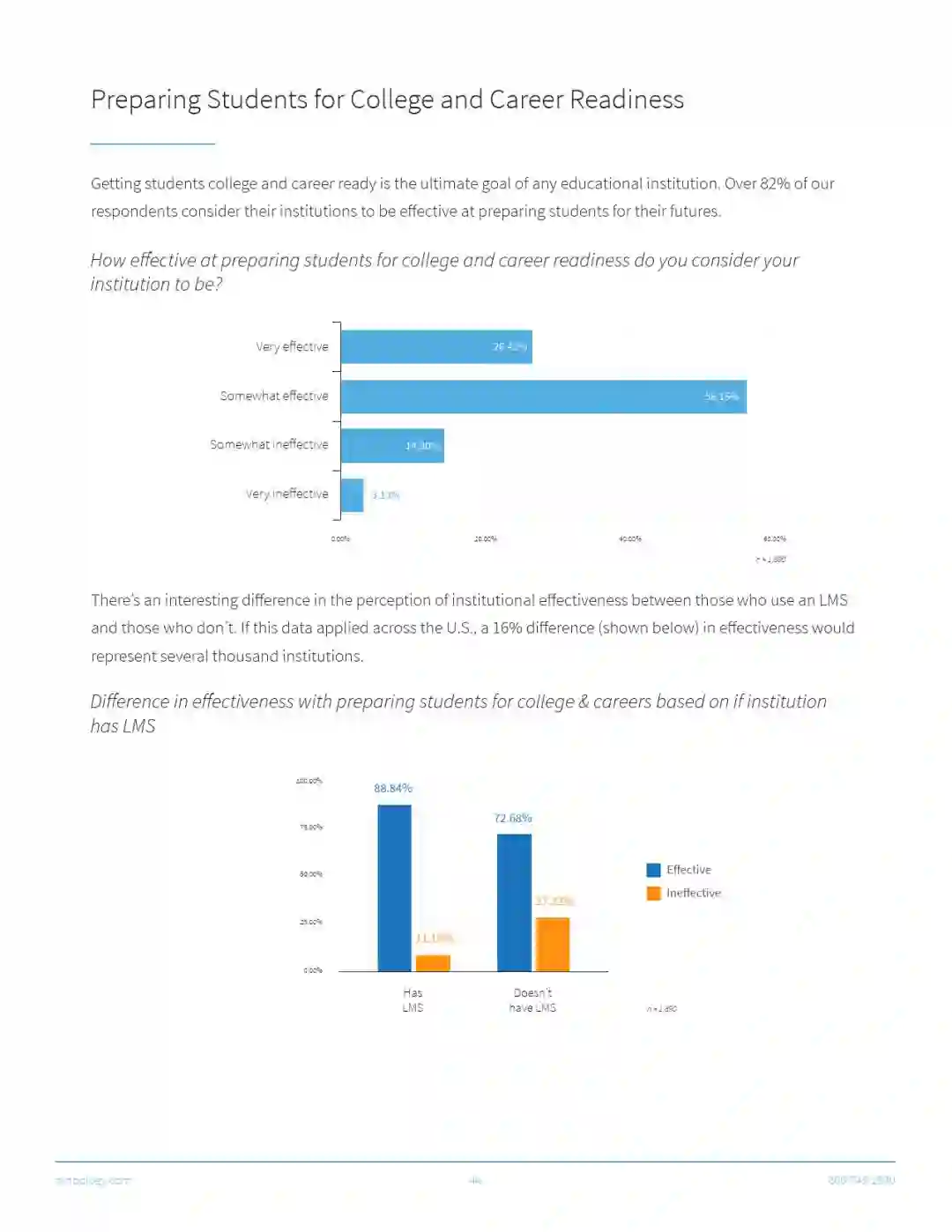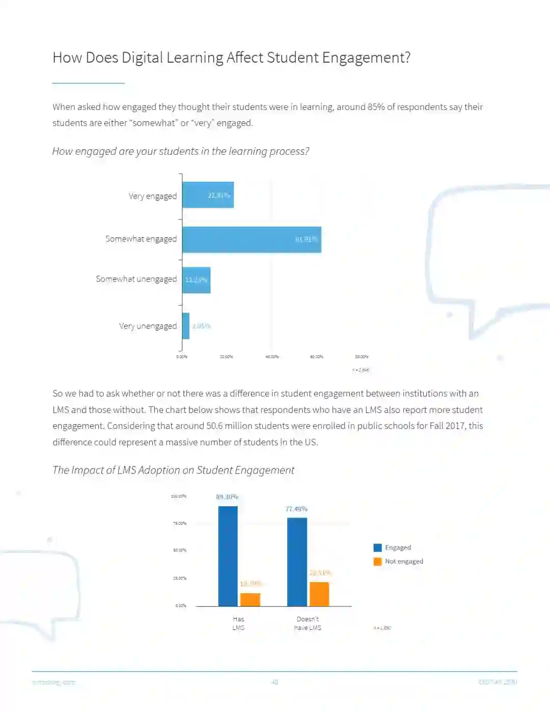 所以在2846名教育从业者的调查中,46%的人说他们有一个LMS系统,20%的人说没有系统。33%的人说他们不确定(这个疑问可能来源于受调查人群中相当大一部分人并非教学人员)。而交叉分析的结果显示,那些说自己有LMS系统的人,学生的参与度也更高。