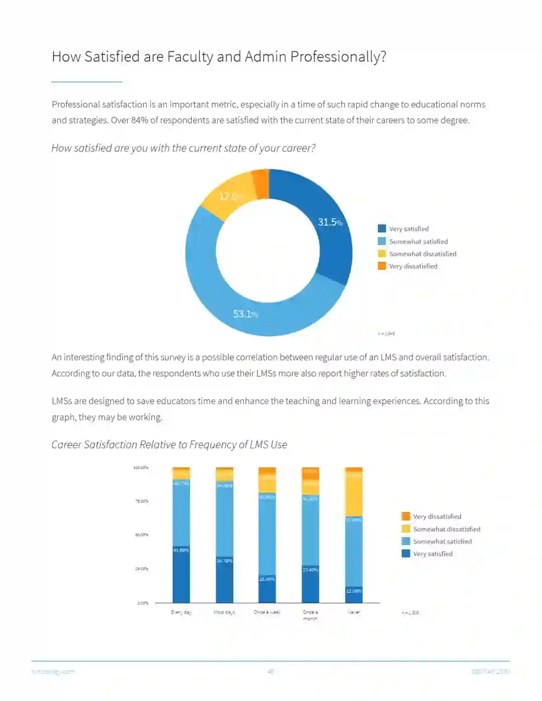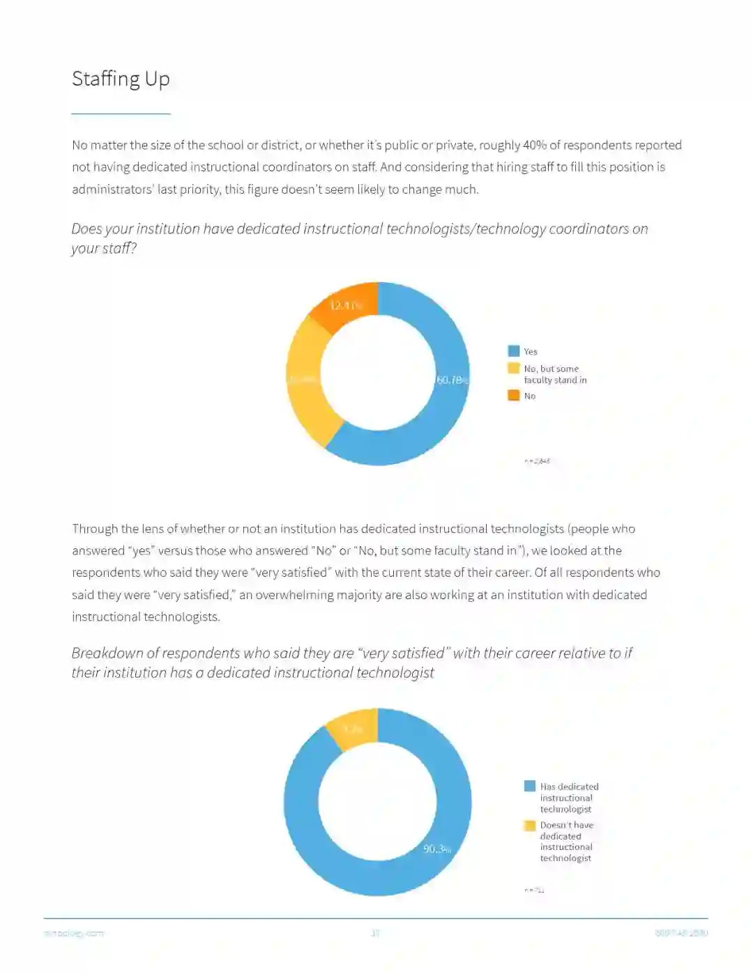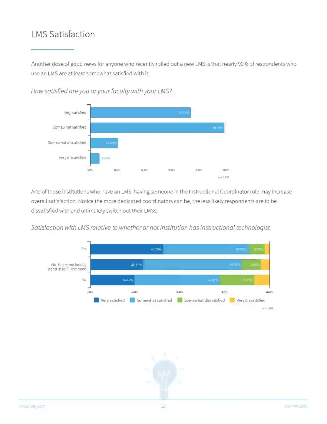 受访者还表示,那些配备专业技术人员的LMS系统(即学习管理系统)有更高的满意度。除此以外,那些配备兼职技术人员的LMS系统的满意度比配备全职技术人员的要低,但是比完全没有技术人员的满意度要高。原因可能是技术人员提供的支持和指导数量的差别。
