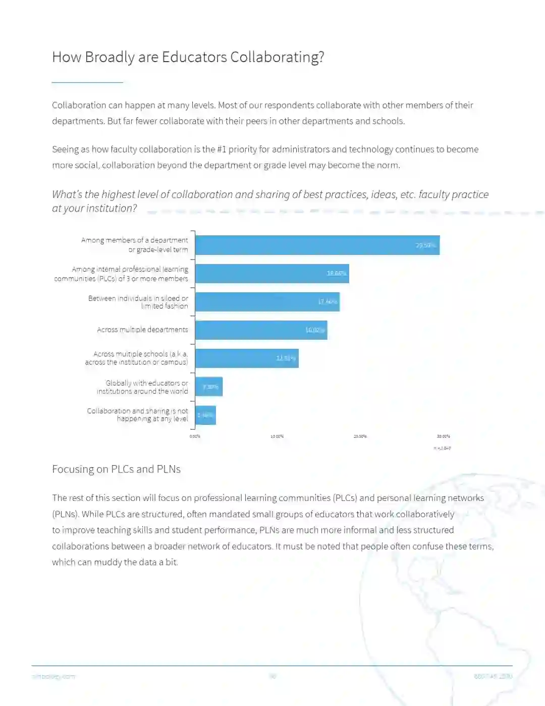 还有一个访谈问题是学校内部的协作程度,近66%的访谈者说合作只停留在各部门之间。只有3%的受访者说他们在全球都有合作。