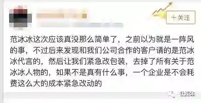 昨日,已有网友在微博上发声称,该公司合作的客户紧急要求撤掉了关于范冰冰的形象。但该网友很快删去了这条微博,也未回复每经影视记者的求证。