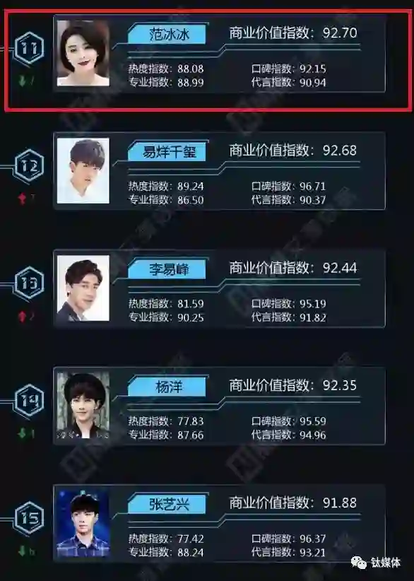 范冰冰的焦点效应不言而喻,她是明星中的明星,其商业价值位居前列。