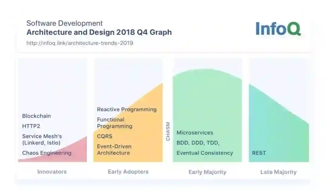 微服务——与“serverless”一样,它是一个容易被滥用或误解的术语。我认为随着它被广泛采用,将进入晚期大众,但可能在分布式架构方面处于早期采用者阶段。