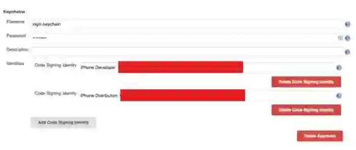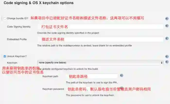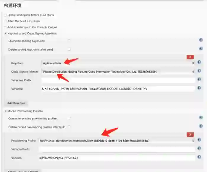 这里我们又需要用到Jenkins的插件,在系统管理页面,选择“Keychains and Provisioning Profiles Management”, (此处是个上面已经配置好login.keychain、证书和pp文件 )。回到我们新建的item,找到构建环境,按下图选好自己的相关证书和签名文件(图是借用的)