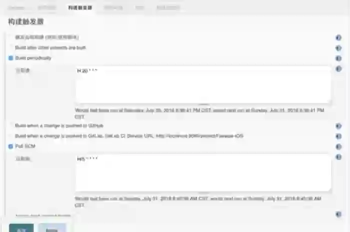 一般设置为类似: 00 20 * * * 每天 20点执行定时build 。当然两者的设置都是一样可以通用的。