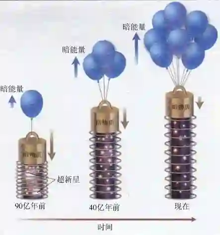 由超新星的观测发现我们的宇宙在加速膨胀示意图。观测发现那些Ⅰa型超新星的亮度比按宇宙减速膨胀预期的要暗(即更远),这意味着遥远的超新星所在星系正在以越来越快的速度远离我们,也就是说,宇宙是在加速膨胀。