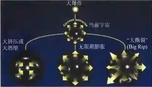 在暗能量作用下,宇宙未来的三种命运走向示意图,即其密度随着时间推移而降低,或维持不变,或者增加。总之,在存在暗能量的情况下,宇宙未来命运取决于暗能量的密度和性质,其最终命运可能是无限膨胀,渐缓膨胀趋于稳定,或者是与大爆炸相对的一个“大坍缩大挤压”;或者也可能膨胀不断加速,称为“大撕裂”,即宇宙尺度在有限的时间内膨胀至无限大,物质连接物、原子、分子甚至亚原子粒子都将被撕裂。据有的研究认为此情形可能在未来宇宙年龄220亿年内发生。目前,由于对暗能量的性质缺乏了解,还难以对宇宙的命运做出肯定的预言。