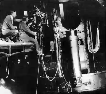 美国天文学家哈勃和著名英国科学家詹姆斯• 金斯坐在威尔逊山天文台口径2.5 米的胡克望远镜的观测室里。伴随天体照像技术的进步,天文学家可揭示肉眼无法看到的暗弱天体,通过延长曝光时间可显现出越来越多的天体。