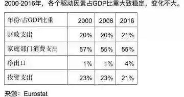 而在欧洲的经济增长中,家庭部门消费支出占到了一半以上,并且非常的稳定,如下表所示: