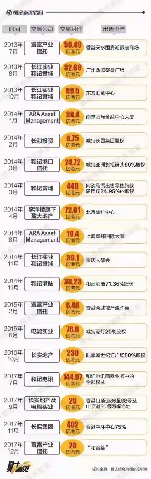 腾讯信息可视化实验室在近期制作了李嘉诚从2013年到2017年12月20日的出售版图和购买版图,我们来看看: