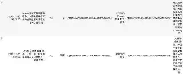 上面的数据集包含了《至爱梵高》影评的诸多信息,下面我们将以影评内容( content 列)为分词与词云绘制的重点对象。