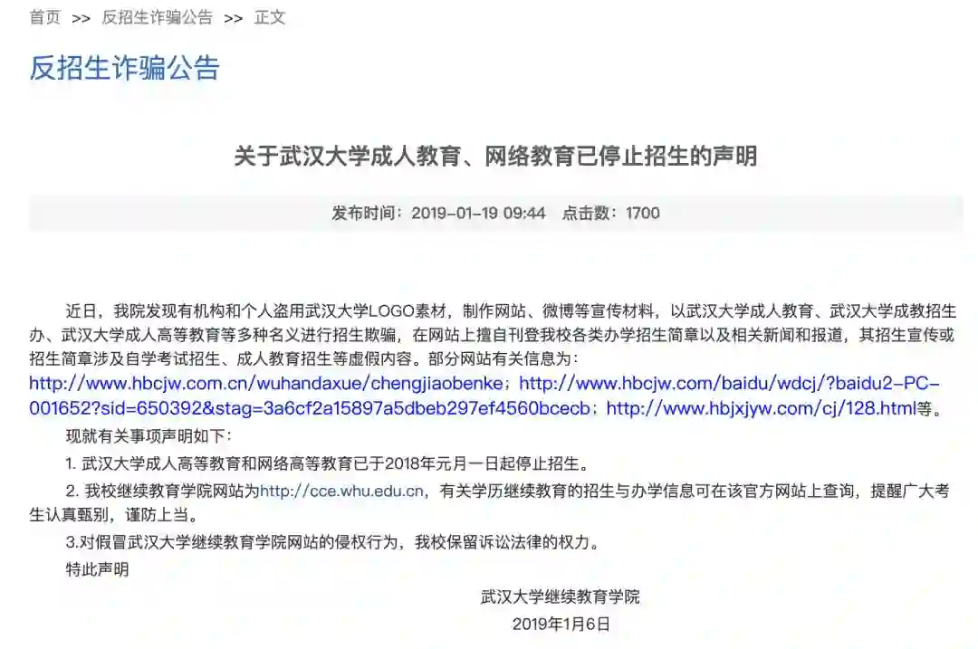 据了解,2019年1月19日,武汉大学继续教育学院官网曾发布公告称,该校成人高等教育和网络高等教育2018年元月1日已停止招生。