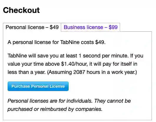 目前,TabNine 的个人许可用费用为 49 美元,商业用途费用为 99 美元,个人必须注册 Deep TabNine 测试版才能访问新的深度学习功能。购买许可之后, TabNine 能够索引更多文件,给出更多相关建议。