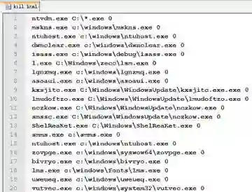 除了通过删除账户对主机的控制权进行争夺外,“隐匿者”也会结束与其他黑客团伙攻击相关的病毒进程。在攻击期间,“隐匿者”所使用的结束进程列表会随着其所收集到的其他病毒数据的增多而不断进行更新。如下图所示: