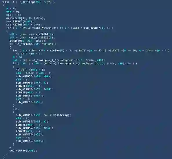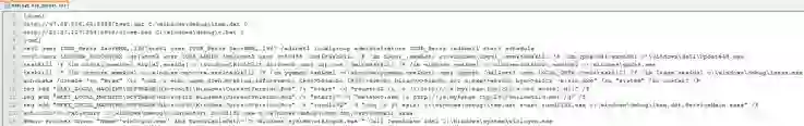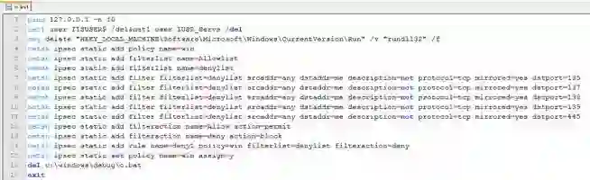根据防御事件信息,我们发现最早出现的防御信息中父进程为系统进程lsass.exe进程,与“永恒之蓝”漏洞触发后特征完全吻合。在使用“永恒之蓝”漏洞之后,“隐匿者”的攻击就可以直接绕过用户名密码的限制,大大提高攻击的成功率。于此同时,“隐匿者”也对其病毒代码进行很大程度的削减。在“永恒之蓝”漏洞触发后,在注入到lsass.exe进程的Payload动态库中,我们发现其主要逻辑首先会执行一段执行配置,配置中包括需要下载的文件和需要执行批处理脚本。批处理中如下图所示: