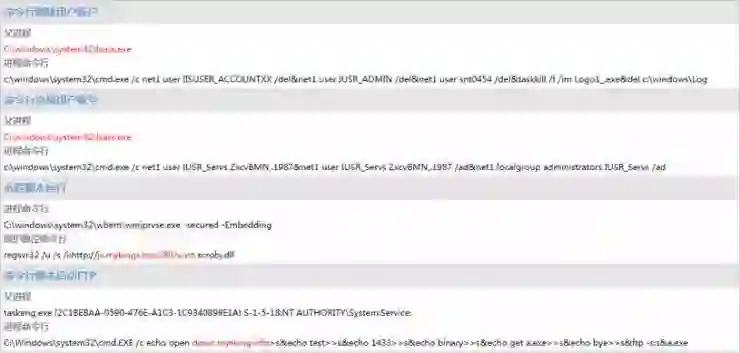 根据上图所示数据,我们可以看出为了争夺这些有限的主机控制权,黑客团伙之间的争夺异常激烈。“隐匿者”通过不断的攻击主机收集到了一些常见的后门账户名,再利用批处理直接对这些常见的后门账号名进行删除操作。