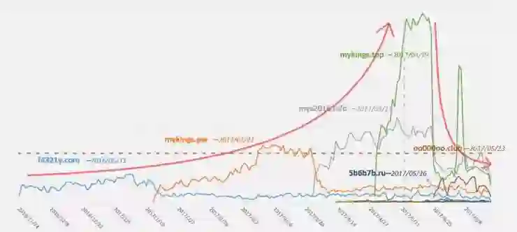 以时间为轴,我们可以直观的看到依托于不同C&C服务器域名的攻击爆发趋势,如下图所示: