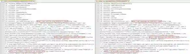 通过样本字符串数据的比对,我们可以看到,mykings.top和oo000oo.club域名相关样本也具有非常高的同源性,在所例举的数据中仅有域名相关部分不同。如下图所示: