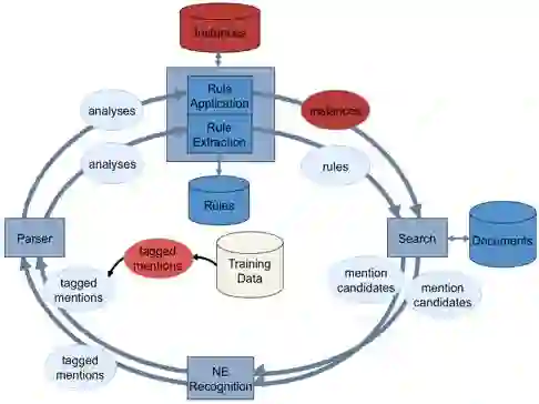 从上图可以看出,我们整个处理流程是一个闭环。从实例开始,进行最小限度监督学习,然后再输入搜索出来的更多实例,尤其是当你的实例达不到1万个时,你可以进行最小限度的监督学习。当你有了很多的实例之后,我们可以把实例不断的加进来,现在我们的系统可以把监督学习、无监督学习、最小限度的监督学习、远程监督学习整合起来。
