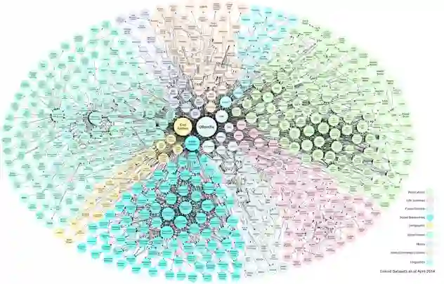 上面这张图其实有好几年的历史了,为什么没新的呢?这张照片的每一个小泡泡,都是一些基于数据的语意知识或者结构式知识库,其实一些像是Web 3.0,一些更像是语意网络,还有一些更像是数据库。但是其实它们在语意上面都是相互联系的,形成相互联系的开放数据。每个小泡上都至少有一种联系将其与其他小泡连接在一起,在这么多泡泡当中,你会看电影数据库、名人信息数据库,化学元素数据库等等。为什么已经过了好几年我们还在用这张图?因为现在这样的一张图没有办法再把其他这几年新的内容加进去,这张图已经容纳不下了。